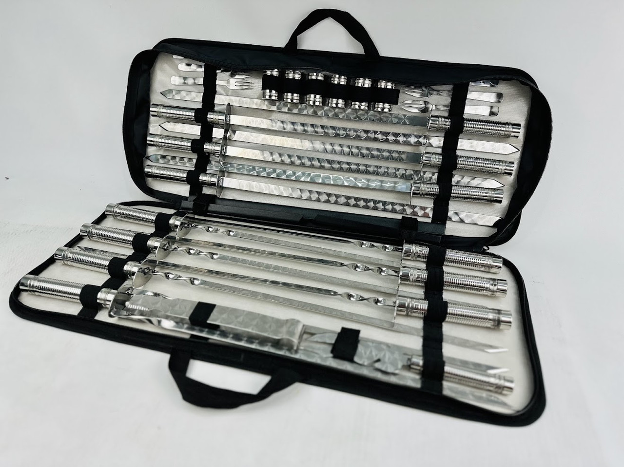 Шампури постачаються в м'якому розкладному чохлі, всередині для кожного предмета передбачені фіксатори.